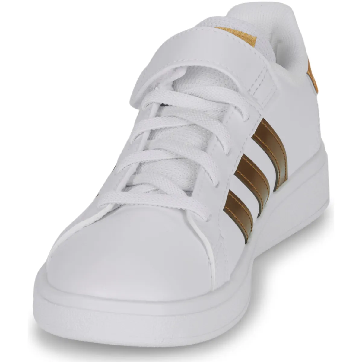 Une chaussure inspirée du tennis aux détails métallisés, conçue en partie avec des matières recyclées.