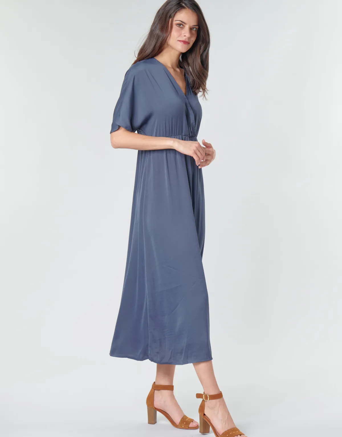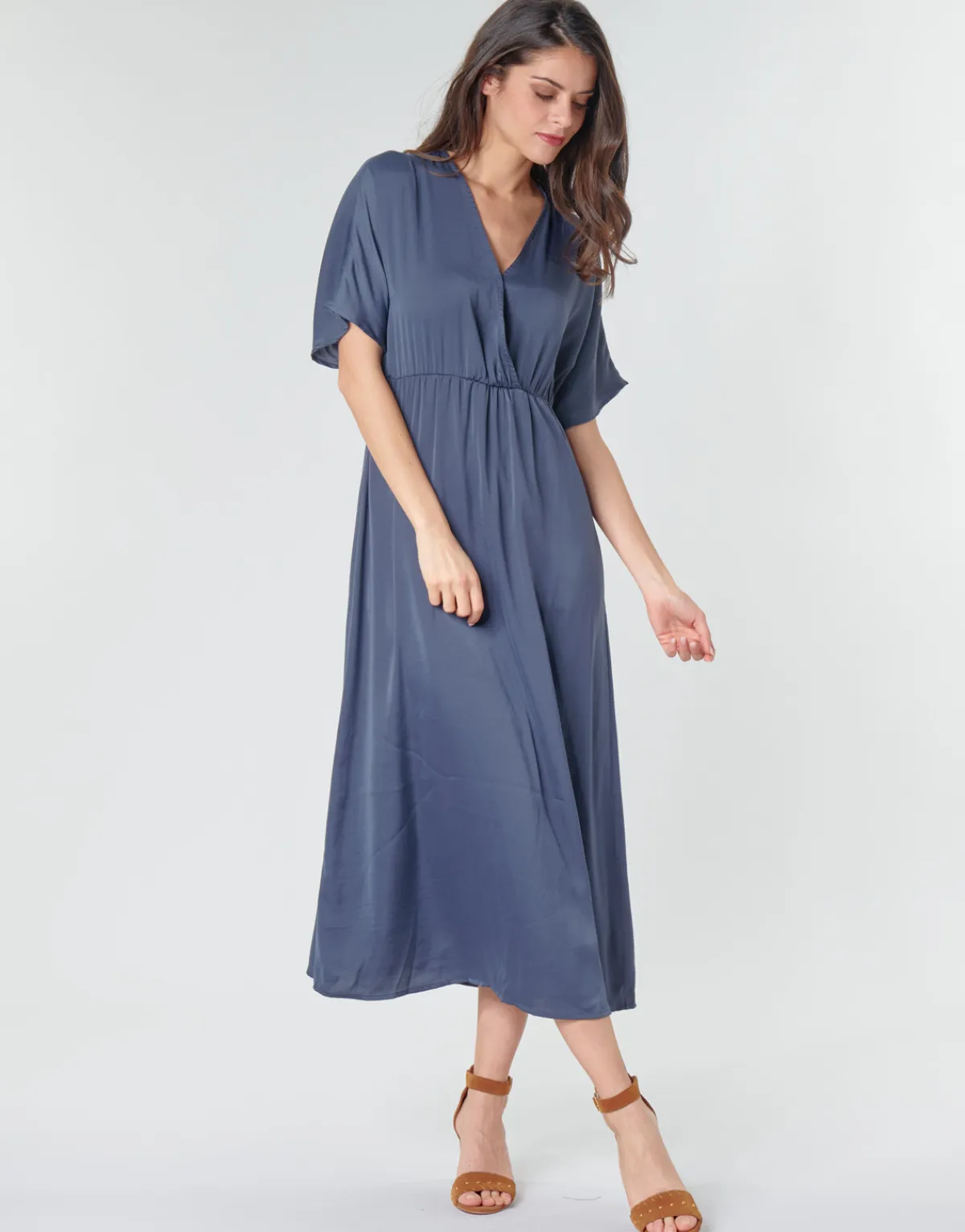 La robe longue gagne à être portée. C’est ce que l’on pense quand on voit ce modèle Betty London. Déclinée en bleu, elle sera un modèle phare du dressing.