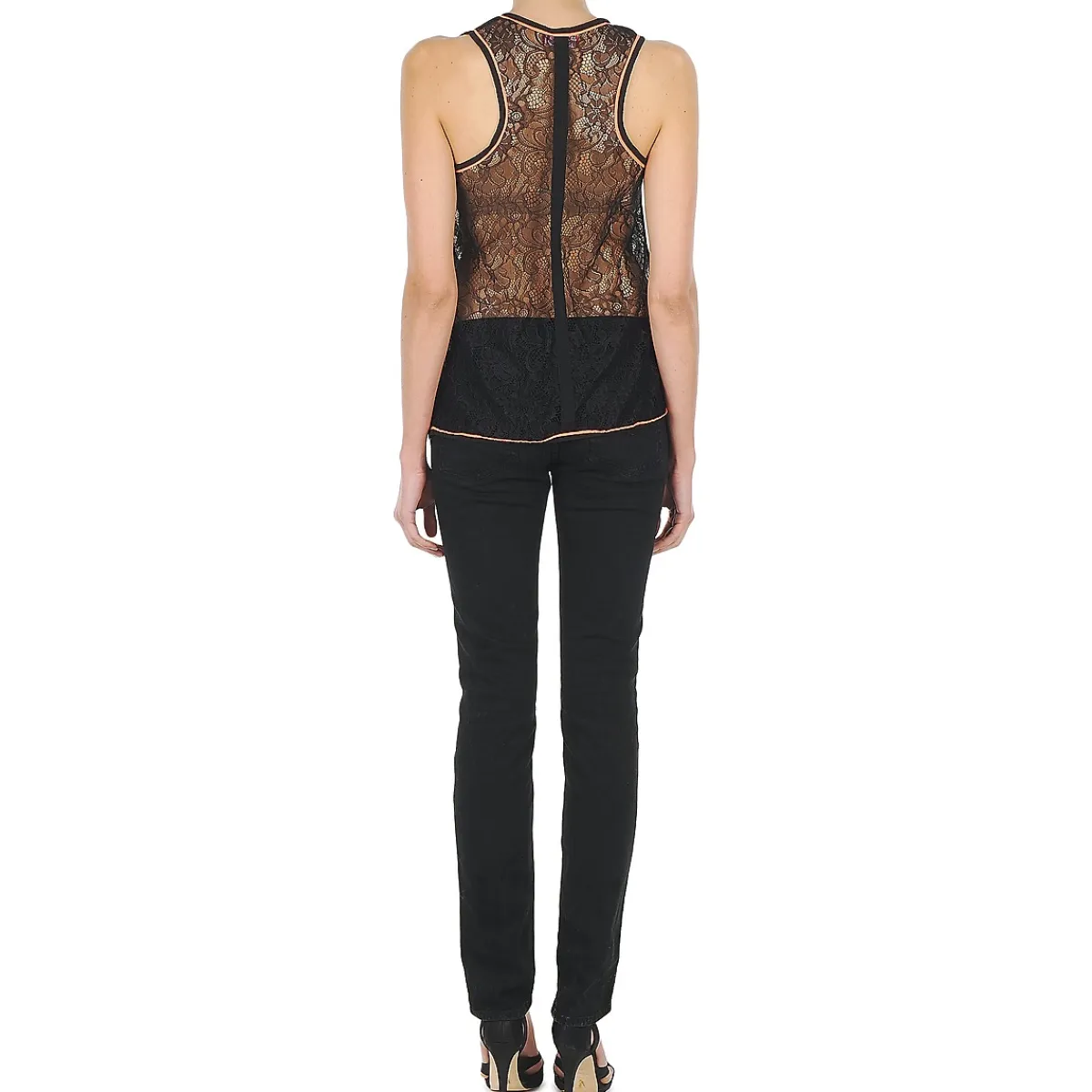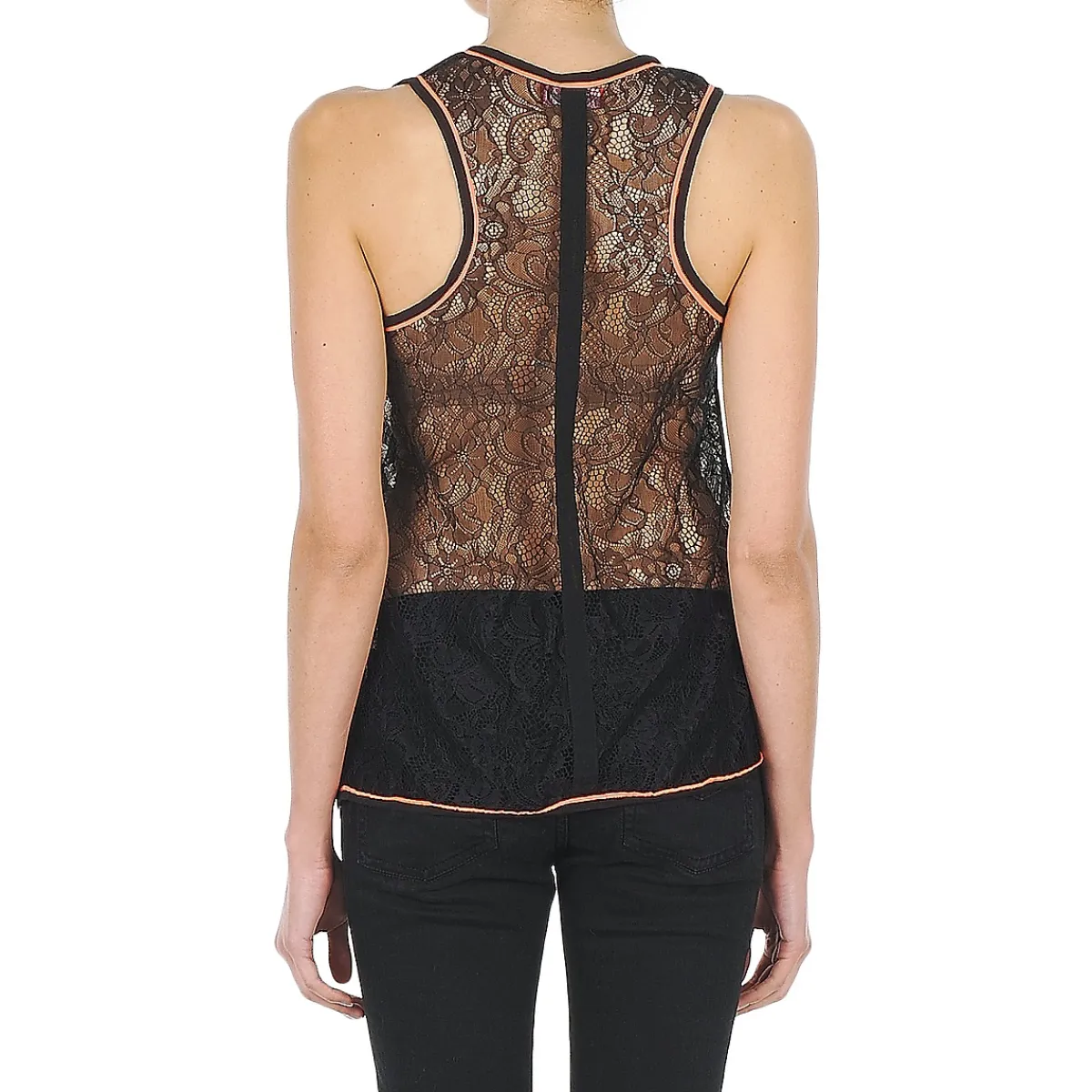 Personne avant Derhy n’avait songé à créer d’imprimé tropical en noir et blanc. C’est donc un débardeur novateur, au dos en dentelle et au col et emmanchures soulignés d’une bordure fluorescente que la marque nous propose.
