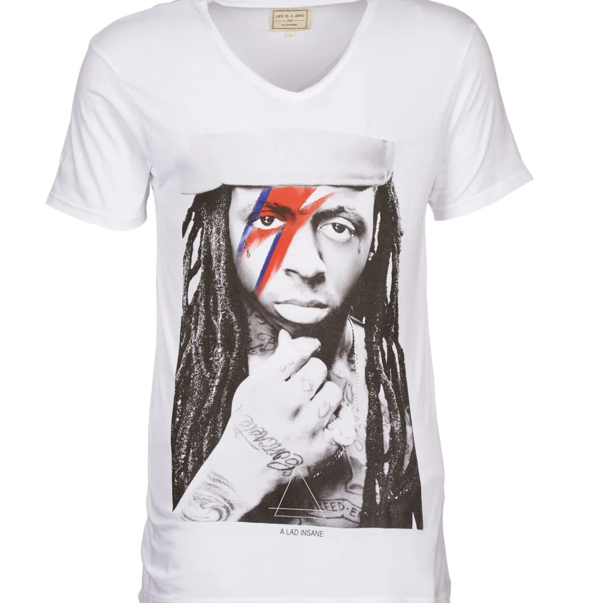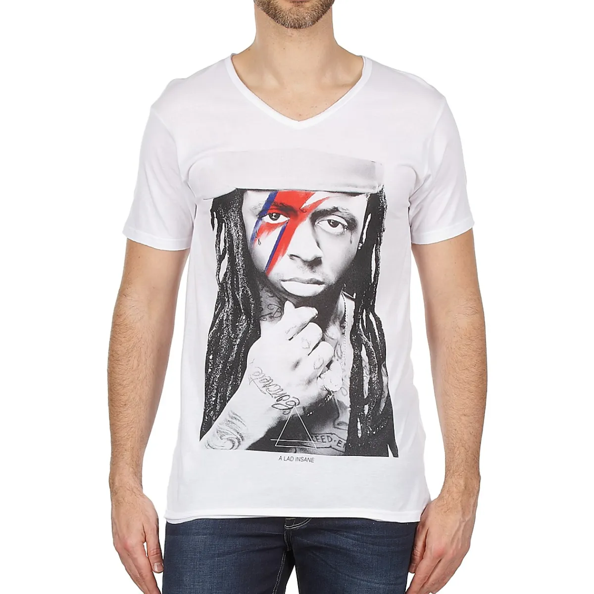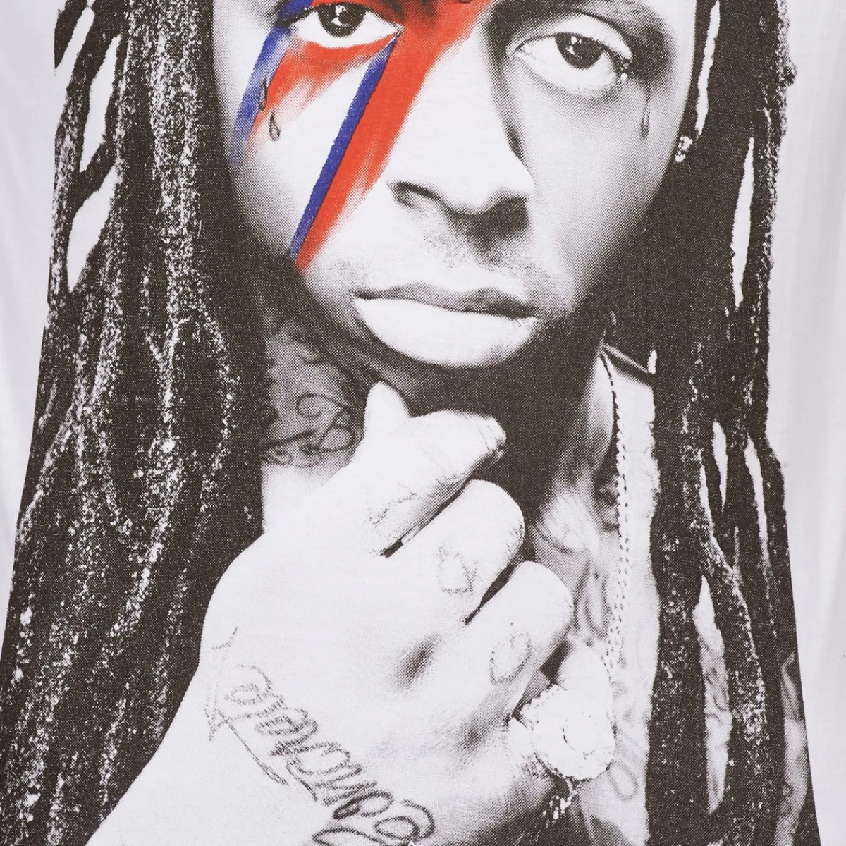 L’humour et l’influence de la culture pop de Eleven Paris se retrouve indéniablement sur ce tee-shirt à manches courtes dont l’imprimé représente le chanteur Lil Wayne affublé de l’éclair coloré faisant allusion à la pop star David Bowie.