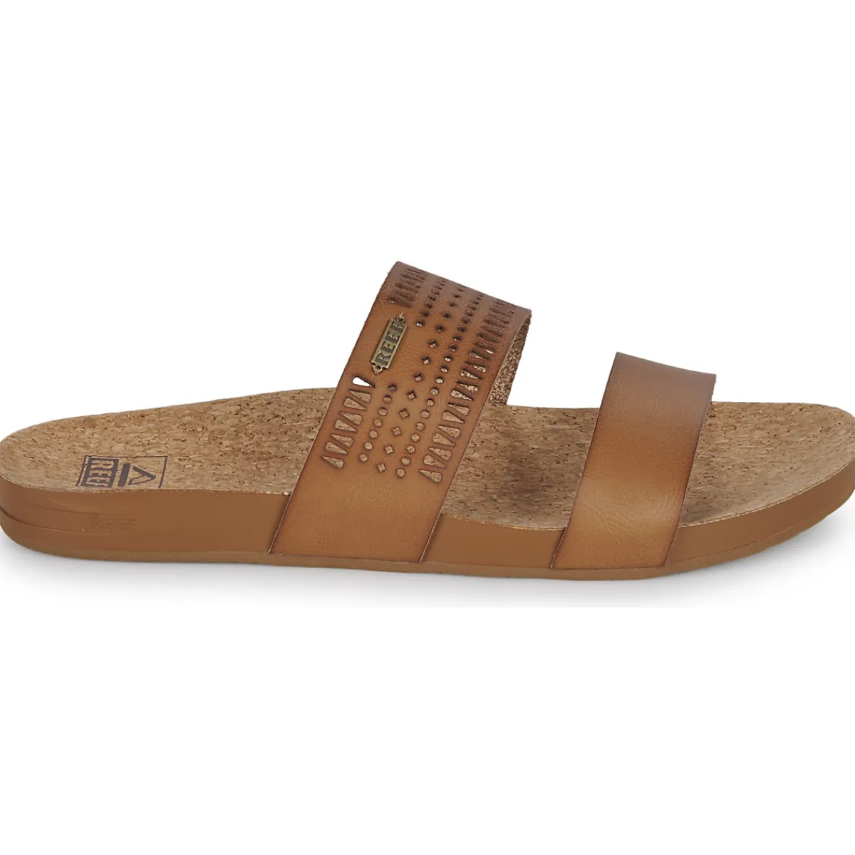 Lanière à deux bandes en cuir vegan sans PVC super doux et non doublé, avec perforations décoratives. / lit de pied ultra confortable, avec un mélange parfait de coussin et de support de rebond. Il s’agit d’une forme plus large avec un soutien généreux de la voûte plantaire et un renfort du talon avec un revêtement en liège 100% naturel. / Semelle extérieure légère et durable en caoutchouc spongieux