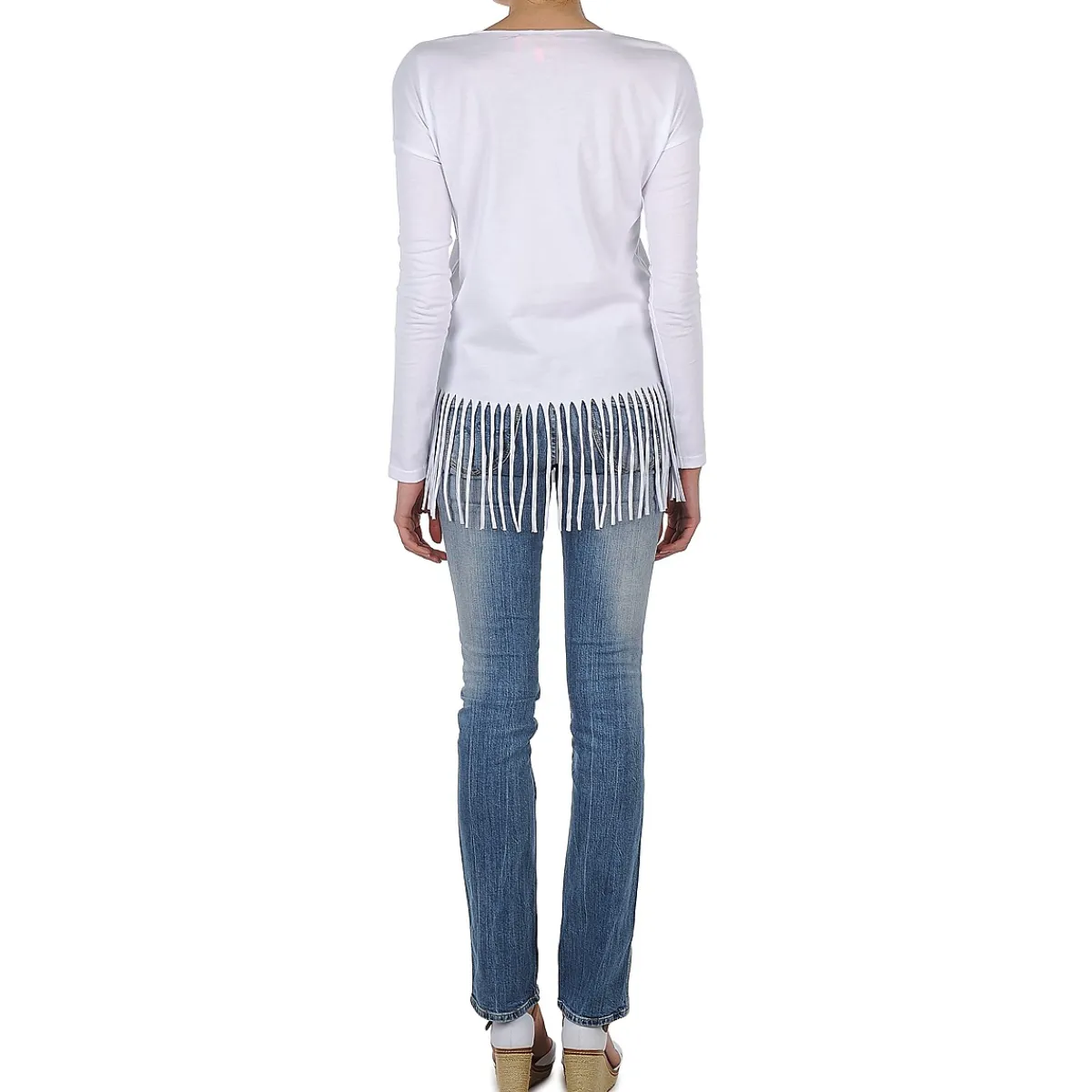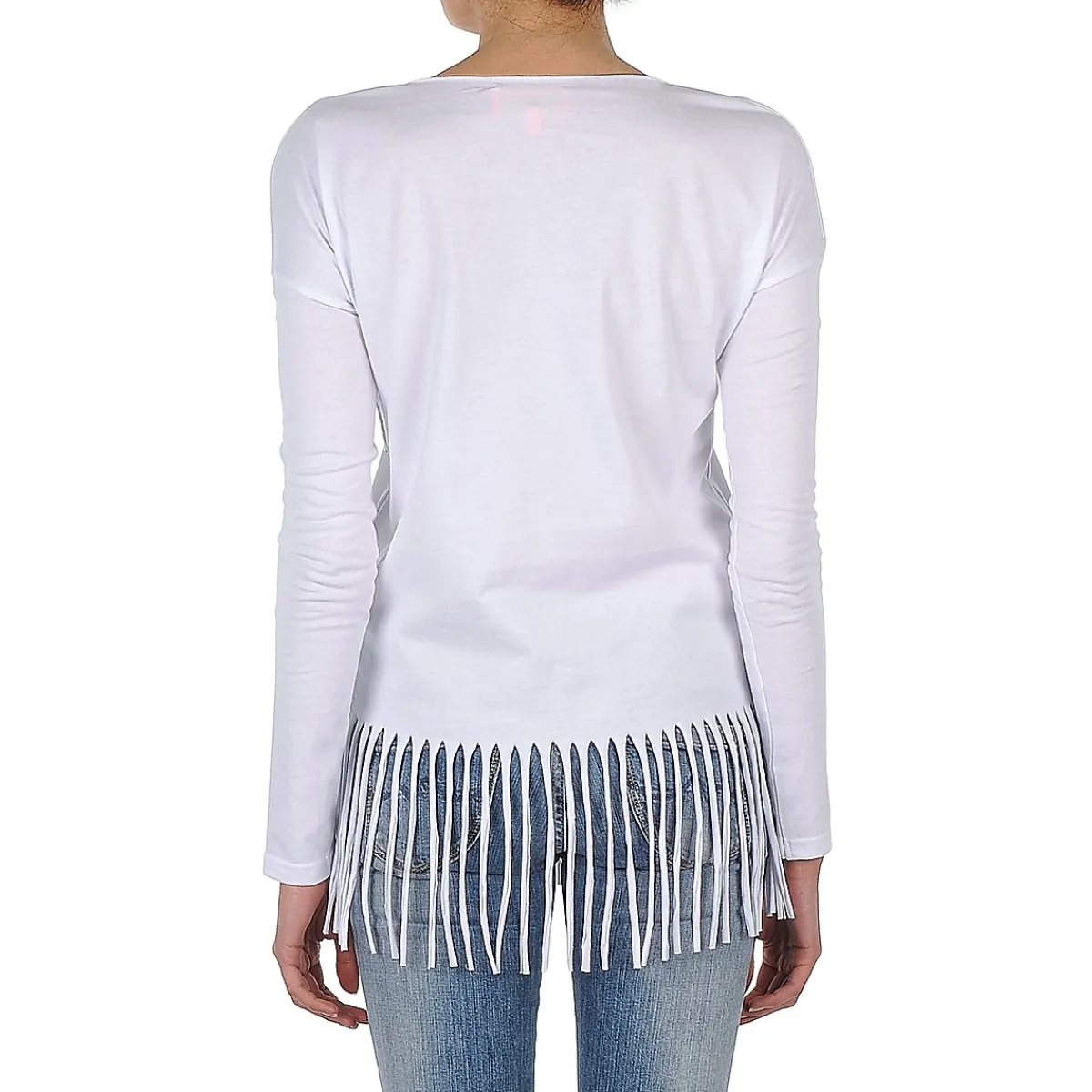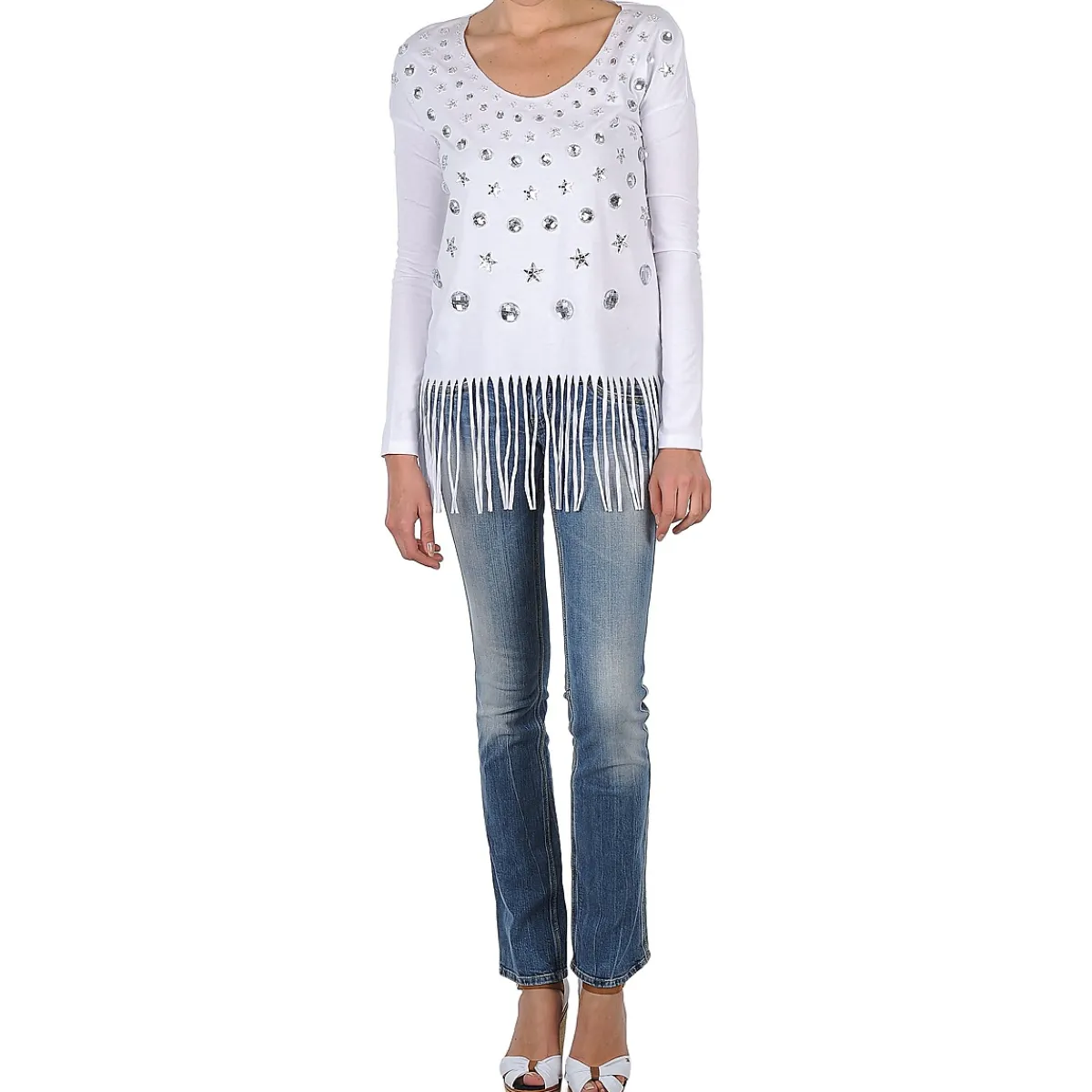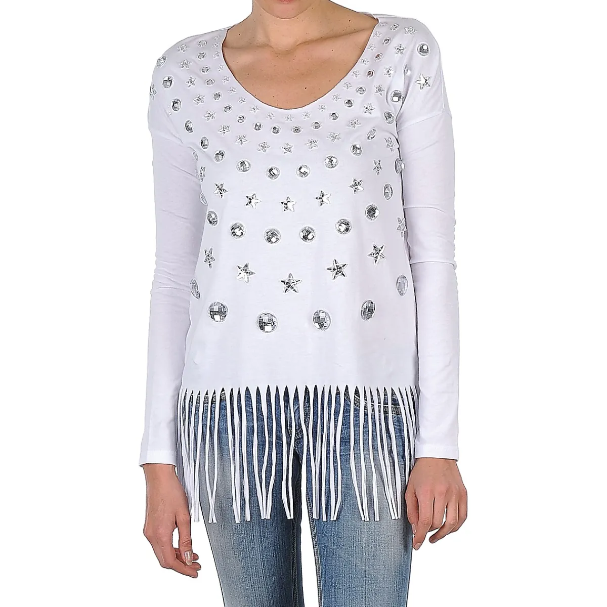À l’approche de l’été, le look bling-bling se fait marin chez Manoush. Il en ressort ce tee-shirt aux manches longues, à la coupe classique et au bas frangé, agrémenté de bijoux de différentes formes représentant des coquillages.
