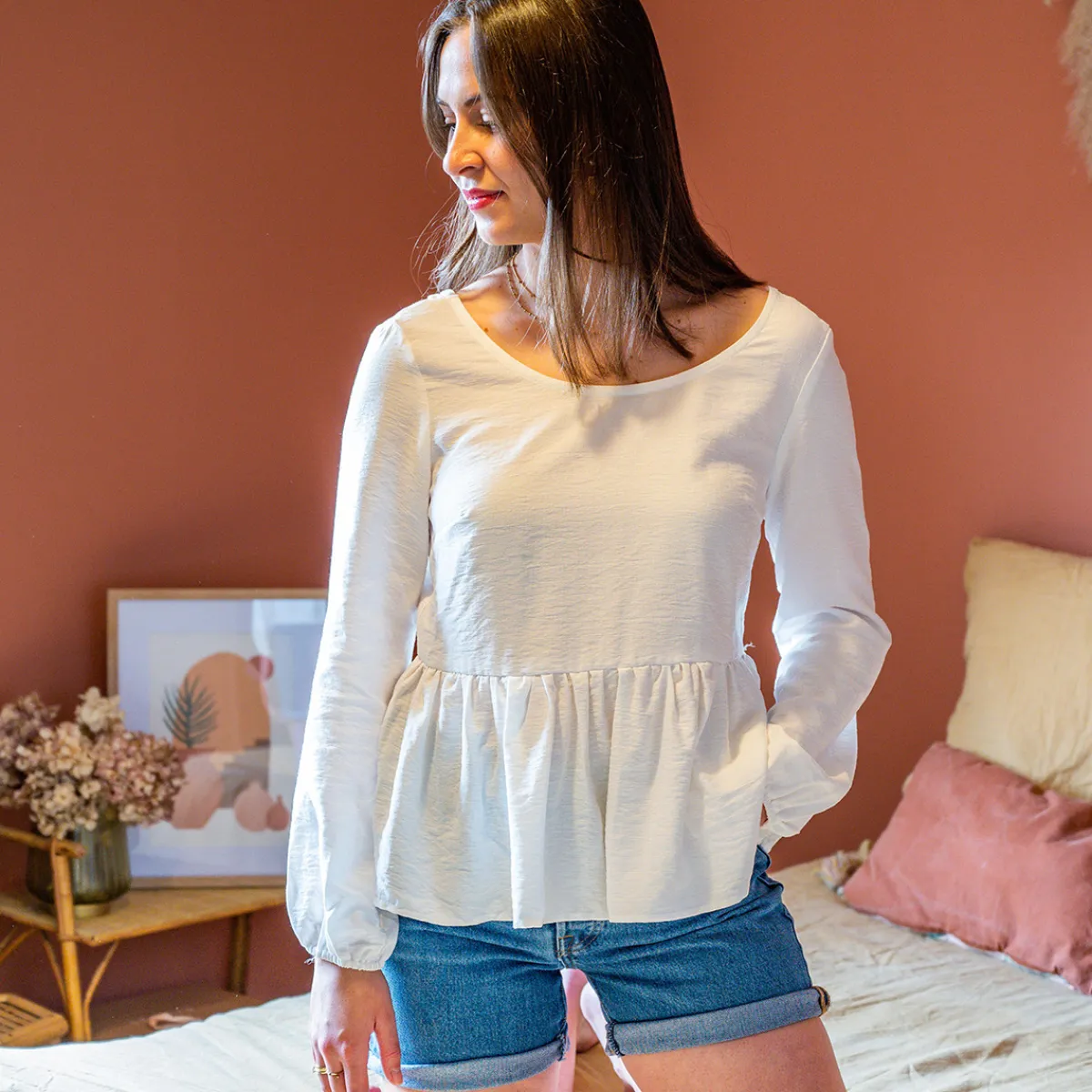 Blouse fabriquée en FranceMatière fluide agréable au porterDos nu en V avec fronces aplatiesFronces à la taillePoign…