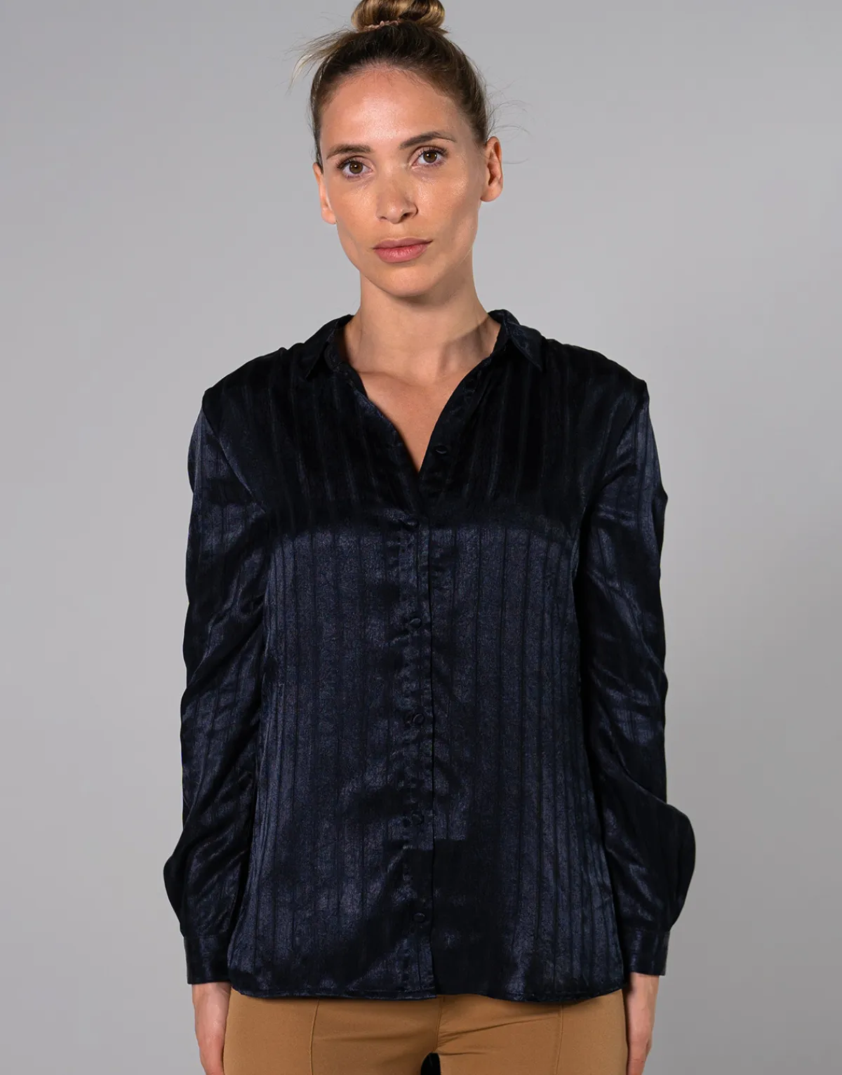 Nina porte une taille SBlouse fluide effet satinRayures finesInformationsFermeture : Bouton(s)Composition : Polyester : …