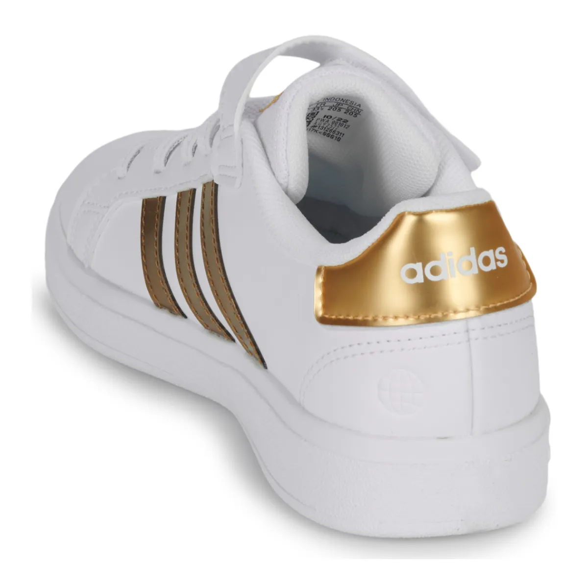 Une chaussure inspirée du tennis aux détails métallisés, conçue en partie avec des matières recyclées.