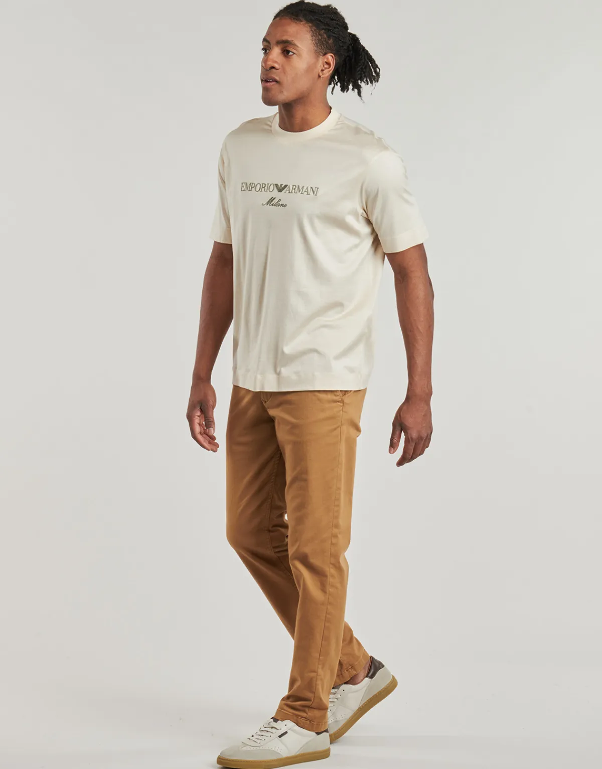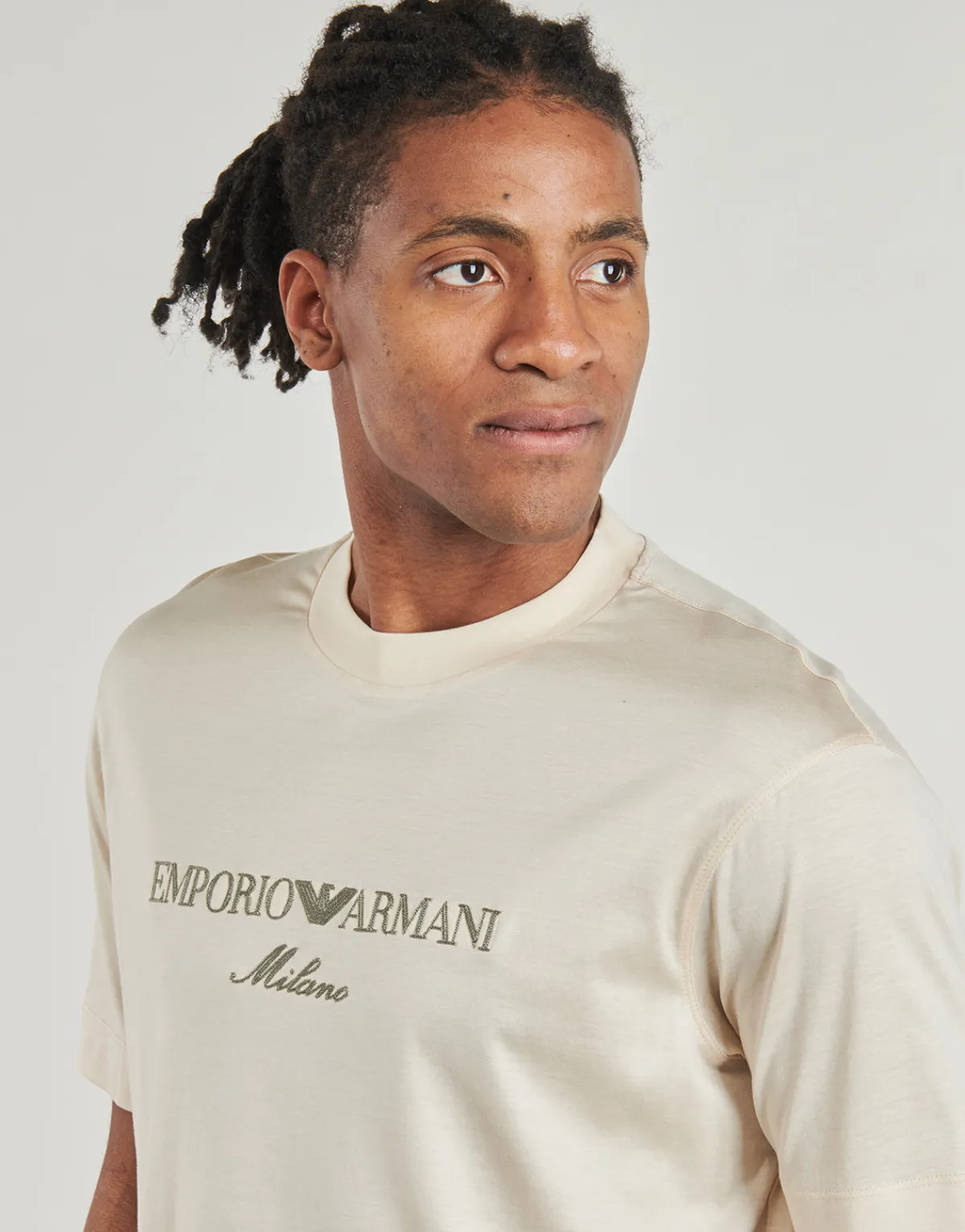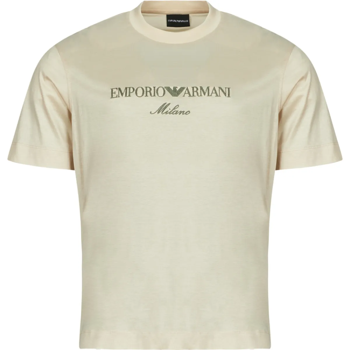 Jamais sans mon T-shirt à manches courtes Emporio Armani ! Dans un coloris beige, il présente une matière composée d…