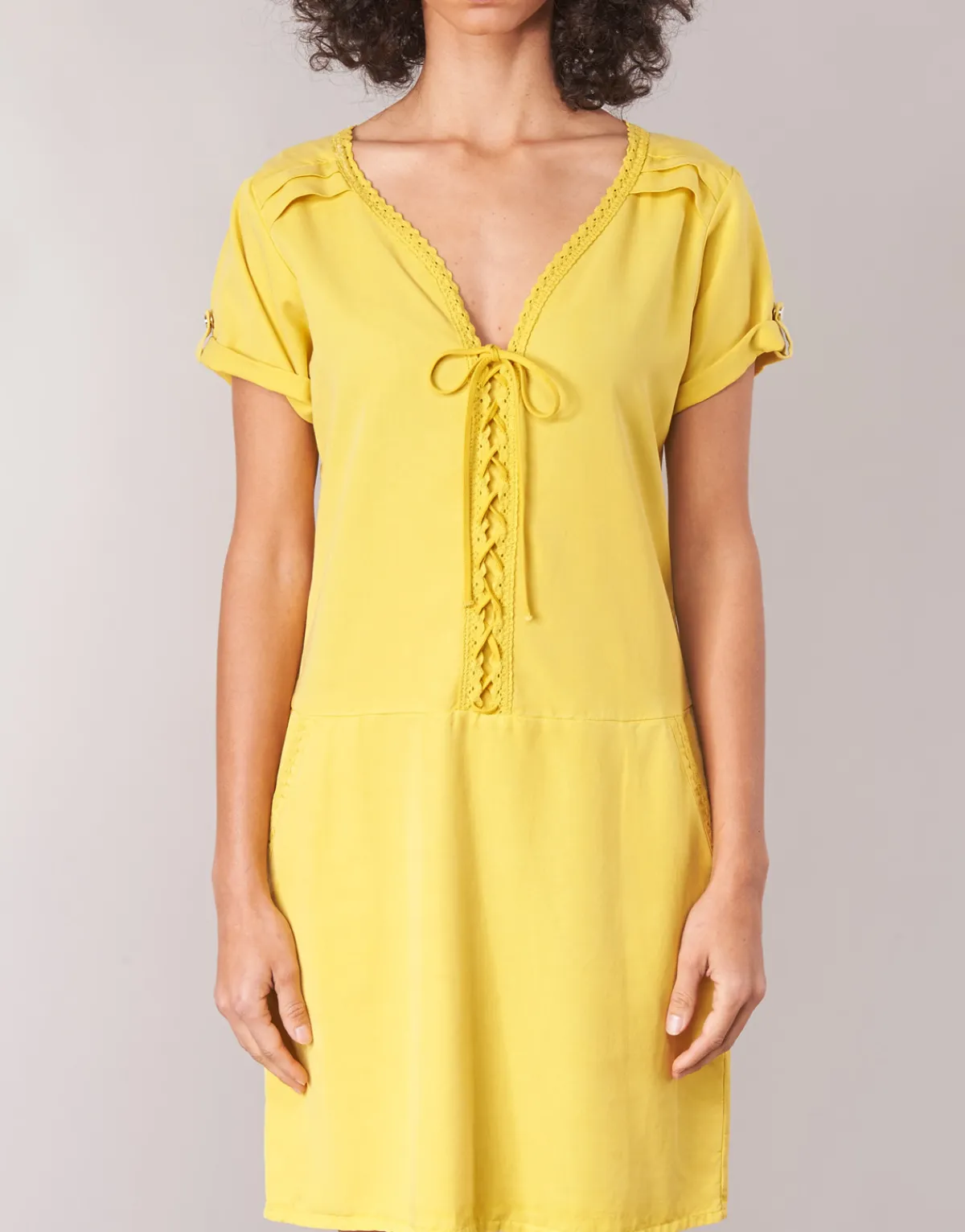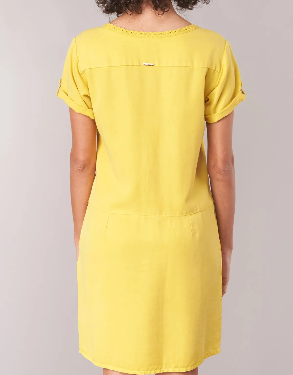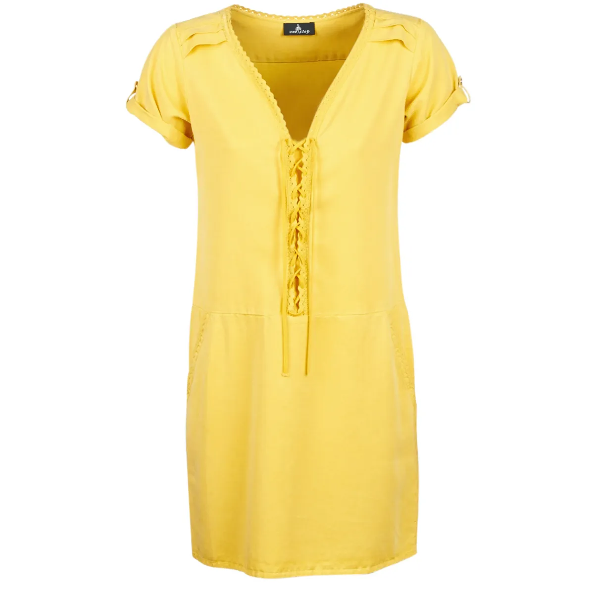 Femme fatale, femme active, femme enfant : à chacune sa robe courte. Cette création One Step pourrait bien vous être prédestinée. Avec sa couleur jaune et sa composition en lyocell (100%) et 100, elle revendique tout son caractère. À la fois simple et raffinée, c’est elle qu’il vous faut cet été.