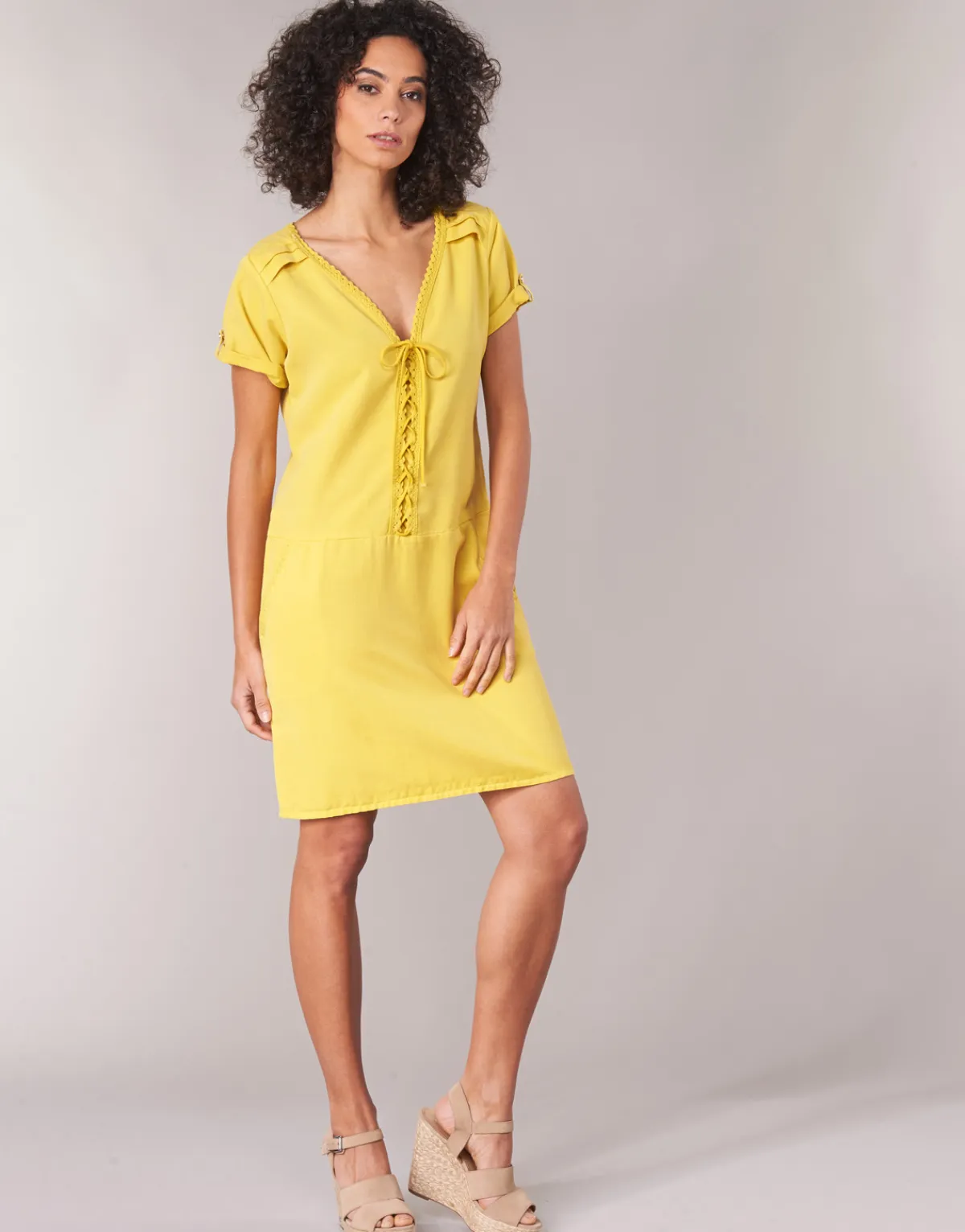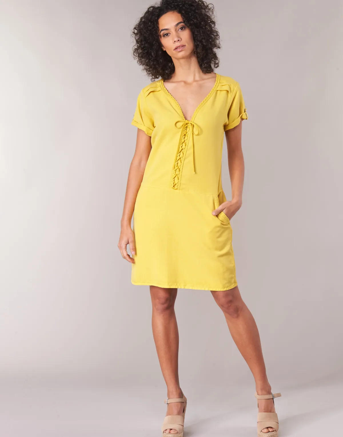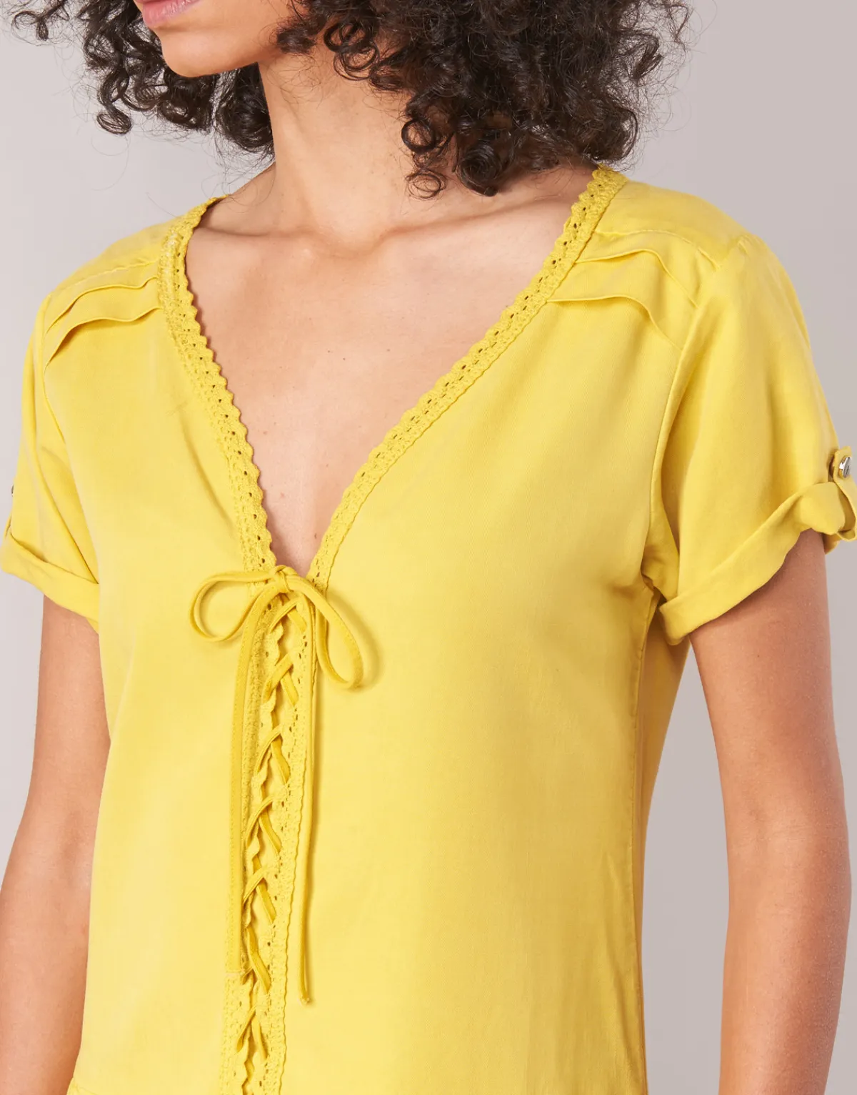 Femme fatale, femme active, femme enfant : à chacune sa robe courte. Cette création One Step pourrait bien vous être prédestinée. Avec sa couleur jaune et sa composition en lyocell (100%) et 100, elle revendique tout son caractère. À la fois simple et raffinée, c’est elle qu’il vous faut cet été.