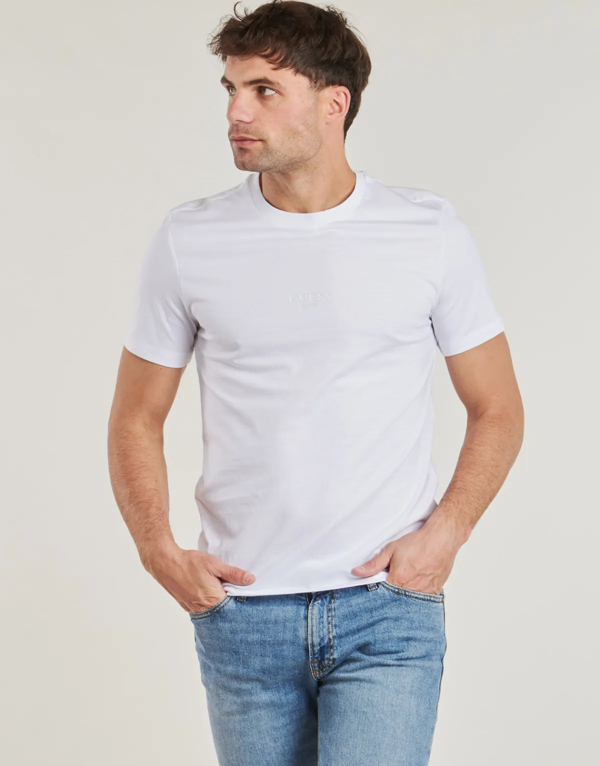 Ce T-shirt à manches courtes annonce la couleur de par son look : on est chez Guess ! Avec sa conception en coton (50%)…